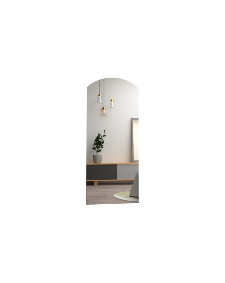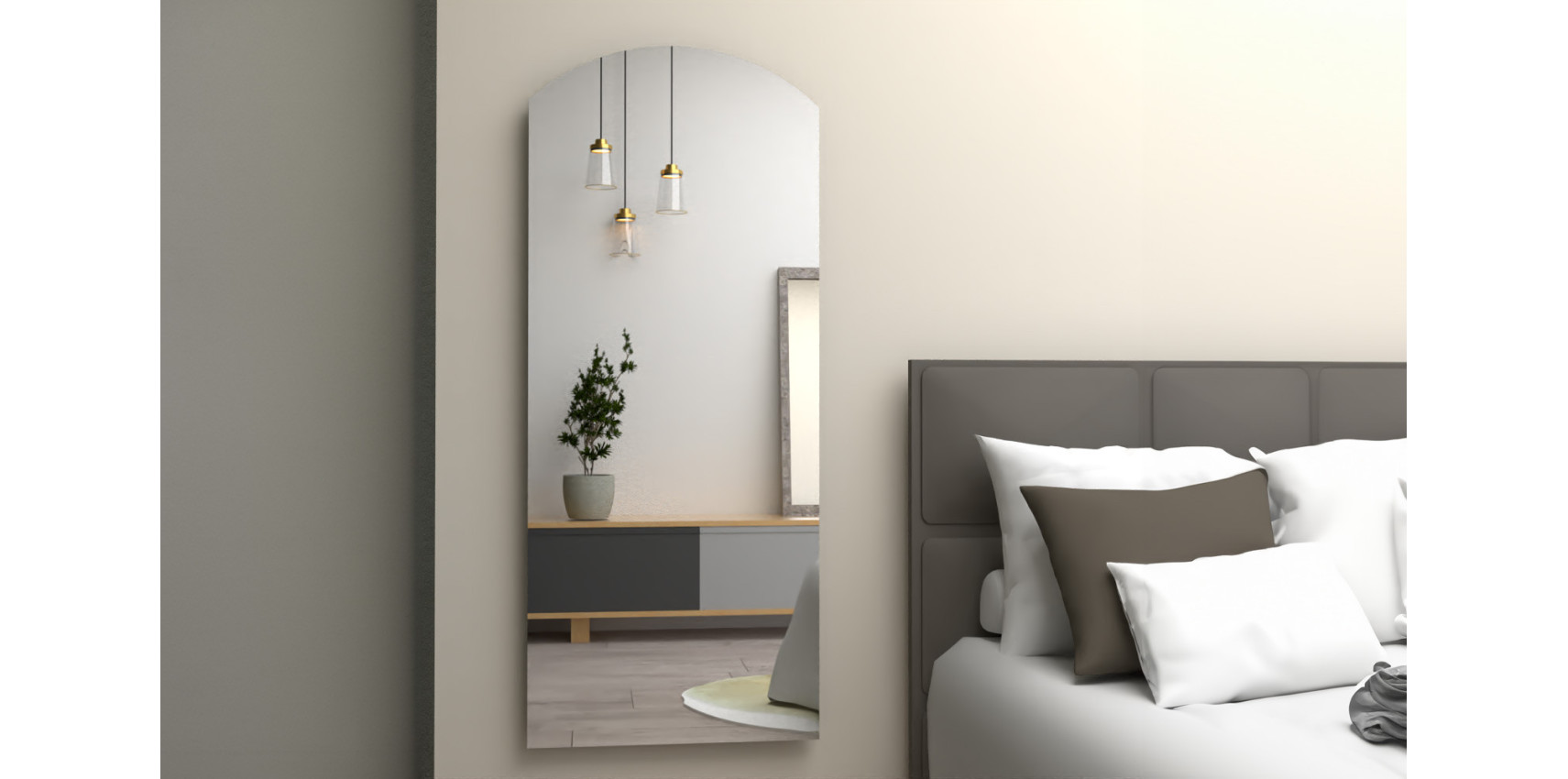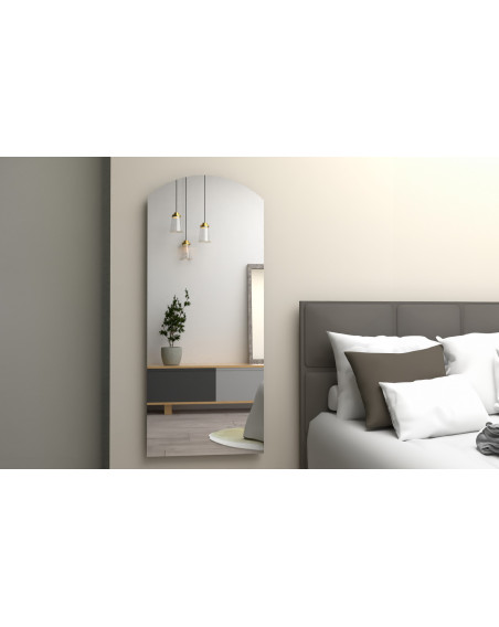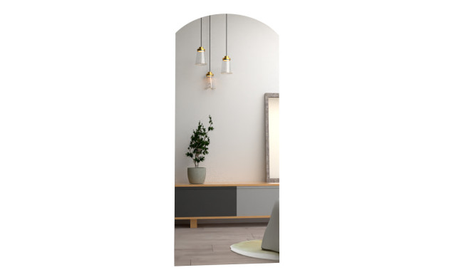 El espejo flotado rectangular con extremo superior semicircular y chaflán para montaje en pared está hecho de vidrio flotado de 4 mm con doble capa reflectiva y pintura de alta resistencia.