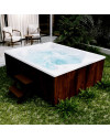 Además, incluye 12 aerojets para aeromasaje y 4 luces LED para cromoterapia, creando un ambiente relajante y terapéutico. El spa también viene con un deck de madera teca, una cama auxiliar para tomar el sol y un mantenedor de temperatura de 5.5 kW