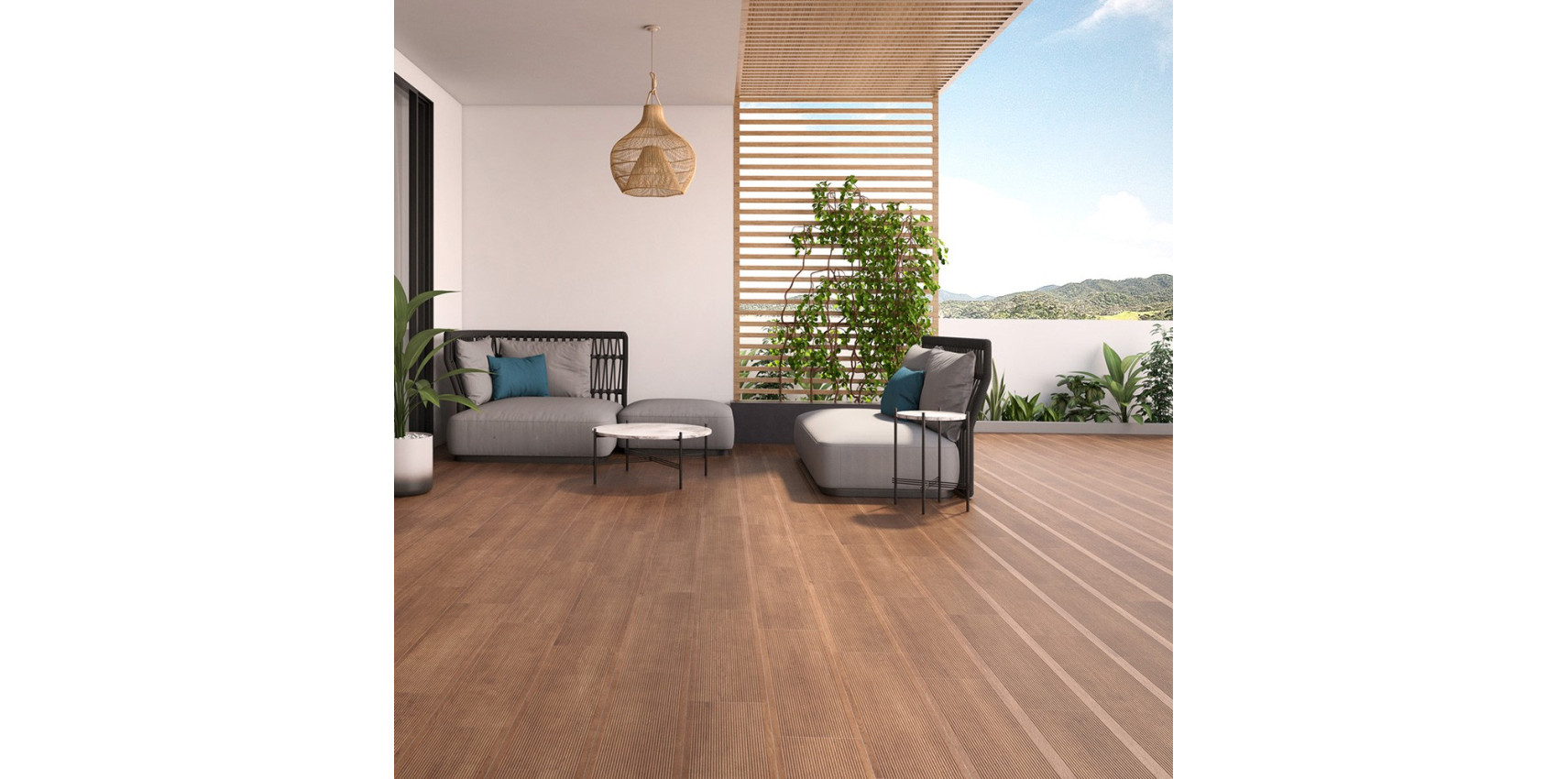 Un pavimento de efecto tarima de madera con relieve capaz de llenar de naturaleza espacios ‘outside’ como terrazas o entornos de piscina. Un producto cerámico único, cuidado en cada detalle, cuya máxima cualidad es poder ser sometido con total garantía a las inclemencias meteorológicas.