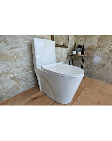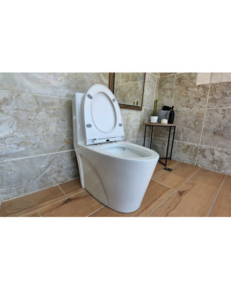 Sanitario con tecnología Rimless, para una descarga en 360°. Fácil limpieza gracias a su asiento removible a solo un clic. Experiencia más confortable gracias a su diseño alongado.